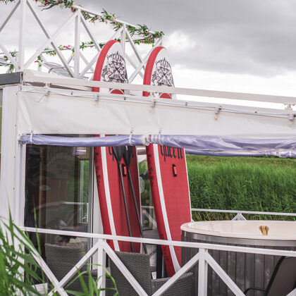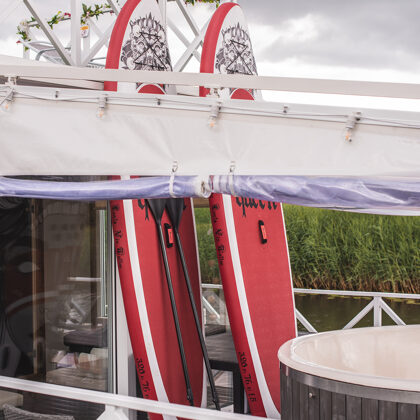 Plosts ir aprīkots ne tikai ar pirti, bet arī ar karstā ūdens kublu, diviem SUP dēļiem, ko var izmantot rezervācijas laikā, kā arī grils, mūzikas iekārta, ērtas atpūtas mēbeles, labierīcības, tādējādi padarot atpūtu uz ūdens par aizraujošu piedzīvojumu kā ģimenes un draugu lokā, tā arī korporatīvu komandas saliedēšanas pasākumu.