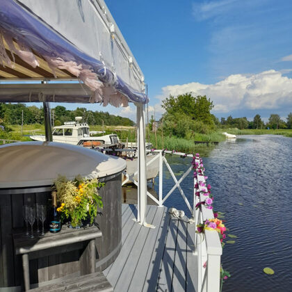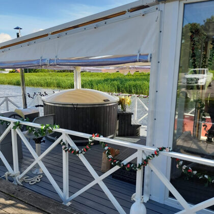 The raft is equipped not only with a sauna, but also with a hot tub, two SUP boards that can be used during the booked period, as well as a barbecue, music equipment, comfortable lounge furniture, amenities, thus making relaxation on the water an exciting adventure for family and friends, as well as a corporate team-building event.